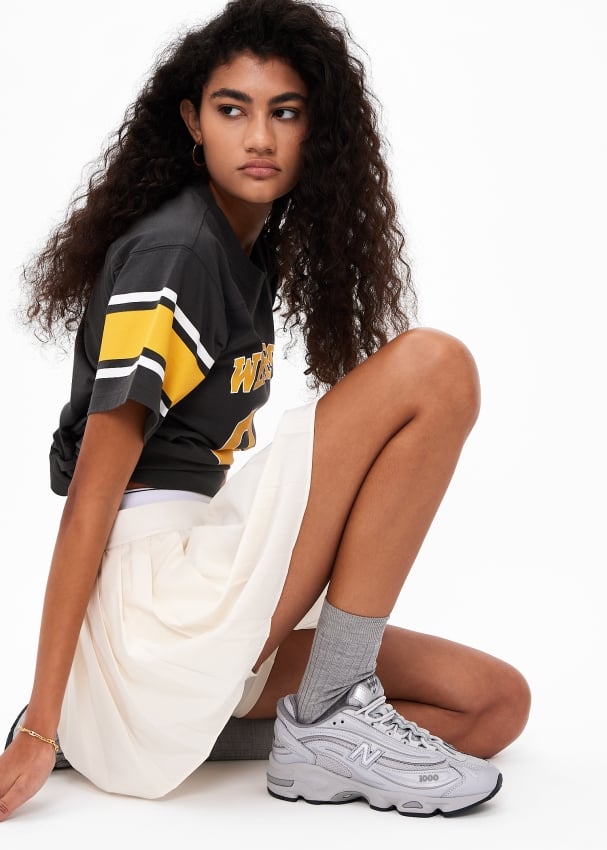 New Balance reintroduces a classic style with a shiny new look. The M1000 sneakers sport a sleek, low-top silhouette with an airy mesh base, metallic silver leather overlays, small N logos on the sides, and a secure lace closure with woven eyelets. Take note of the ABZORB cushioning underfoot for a responsive ride, complete with Stability Web outsole technology that offers superior shock absorption.